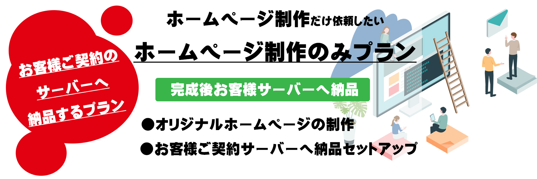 他社レンタルサーバー・ドメインをご契約中で、ホームページ制作のみのご依頼・リニューアルのみをご依頼されるお客様向けのプランです。ホームページ完成後お客様ご契約サーバーへ納品させていただきます。お客様サーバーへ納品のため、納品後は維持費など一切発生いたしません。ネットから自由にページ編集できるCMS(Wordpress)で制作させていただきます。ご契約前にデザイン案を無料で制作しご提案させていただきますのでお気軽にお申込みください。